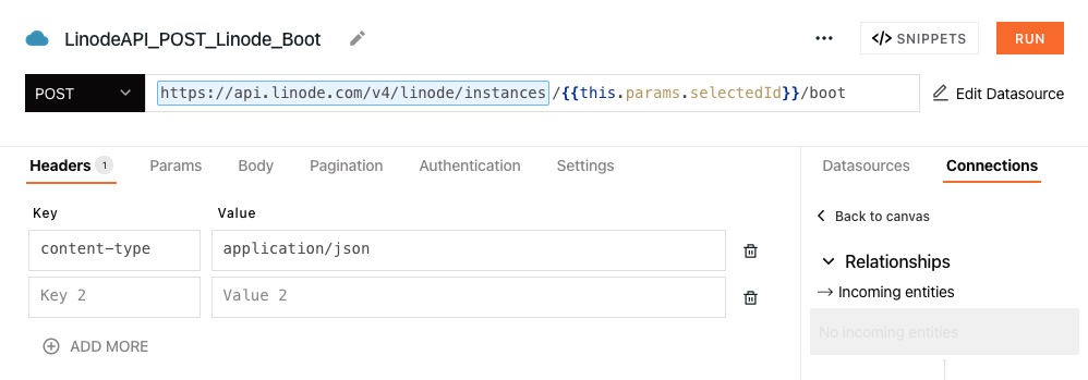 /{{this.params.selectedId}}/bootfor the first query and/{{this.params.selectedId}}/shutdownfor the second. Name the first queryLinodeAPI_POST_Linode_Bootand the second queryLinodeAPI_POST_Linode_Shutdown.The resulting query edit pages should look like these: