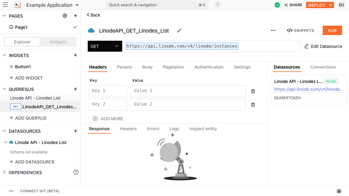 The Linode API is now ready to use within your Appsmith application. From there, Appsmith gives you myriad ways to implement the API into your application.