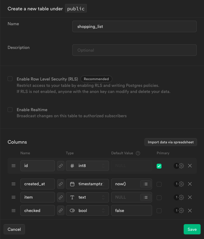 shopping_list. The table has anitemcolumn withtextcontent along with acheckedcolumn withboolcontent and a default value offalse. This is in addition to the default columnsidandcreated_at.When your screen looks like the screenshot below, click Save.